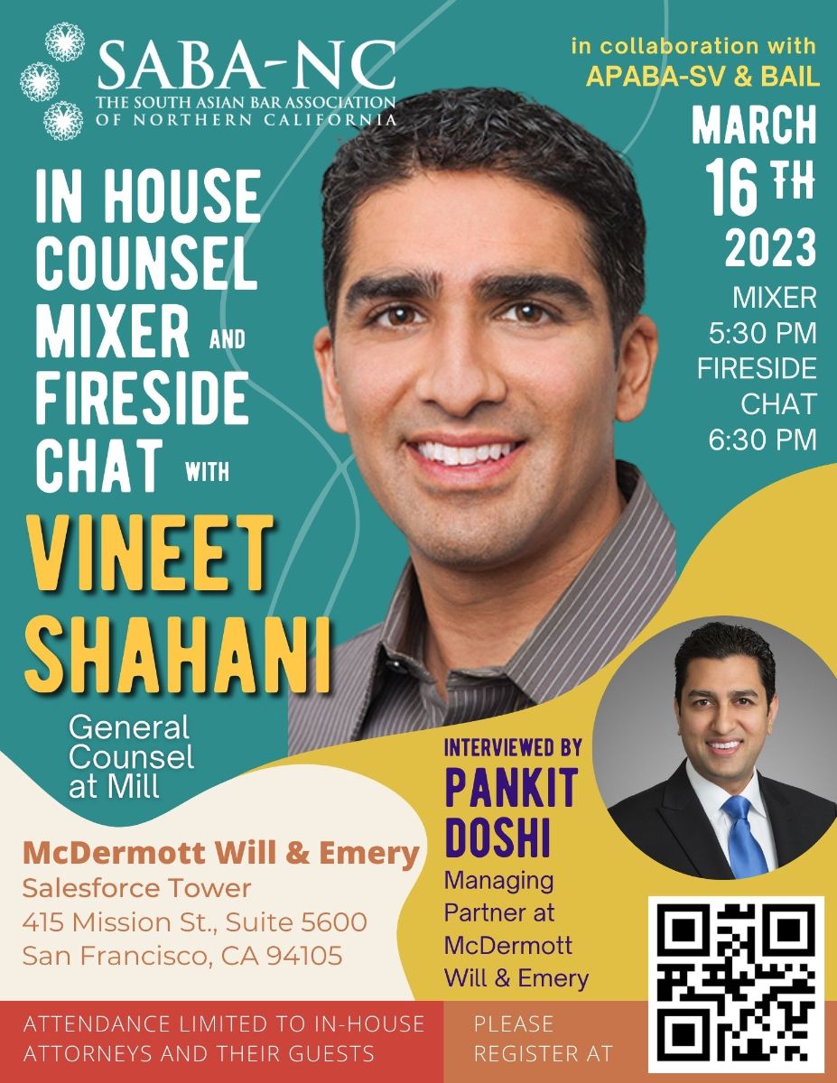 Come join us on March 16th at McDermott Will & Emery's SF offices for an in-house counsel mixer, followed by a fireside chat with the General Counsel of Mill, Vineet Shahani.